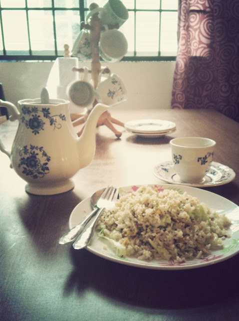 Tumis bahan yang ditumbuk tadi dengan sedikit minyak, biarkan wangi dan garing, boleh masukkan isi ayam atau udang juga. Pecah telur dan masukkan nasi. Biar seketika hingga nasi garing sedikit. Akhir sekali boleh masukkan kangkung, kubis atau kacang panjang. I like to have my naso goreng kampung with kubis beijing yang hijau. :)